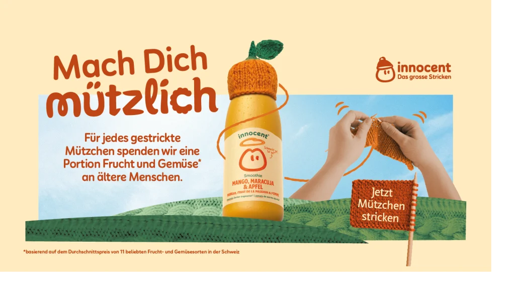 «Das Grosse Stricken» ist eine Aktion von innocent drinks zusammen mit Pro Senectute, welche nach über 13 Jahre zurückkehrt. Unter dem Motto «mach dich mützlich» rufen wir alle begeisterten Strickerinnen und Stricker auf, mit uns und für uns zu stricken.Für jedes gestrickte Mützchen, das ab Herbst 2026 verkauft wird, bekommt Pro Senectute einen kleinen Beitrag. Unser Ziel: 88’888 Mützchen im Zeitraum vom 14. Oktober 2025 bis 1. Juli 2026 zu sammeln.Mach auch du dich mützlich – und stricke für eine Portion Früchte und Gemüse für ältere Menschen!